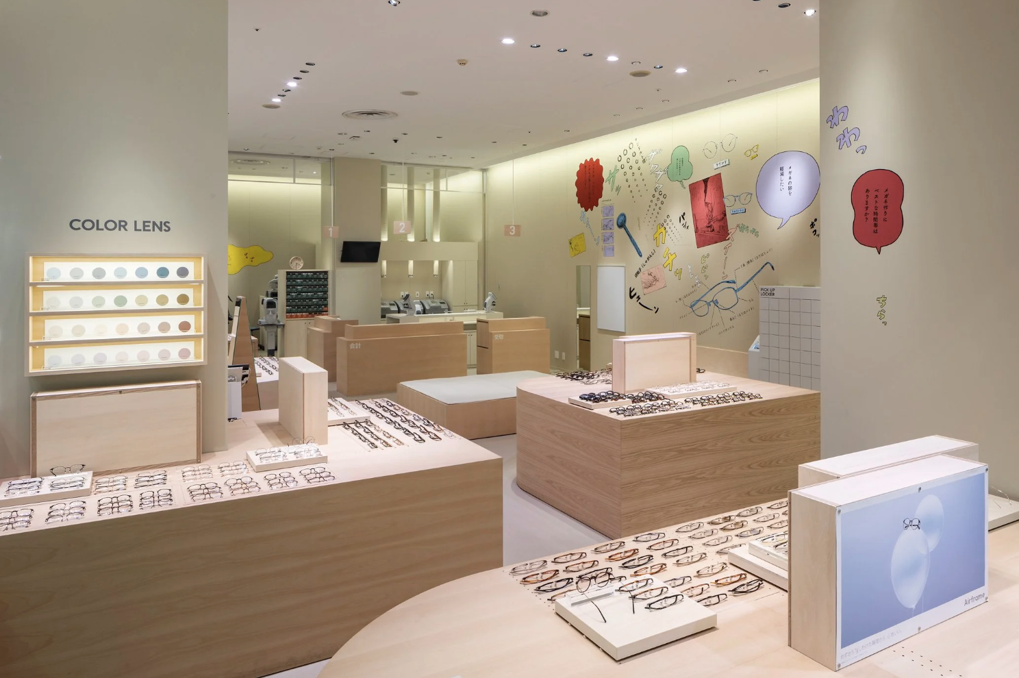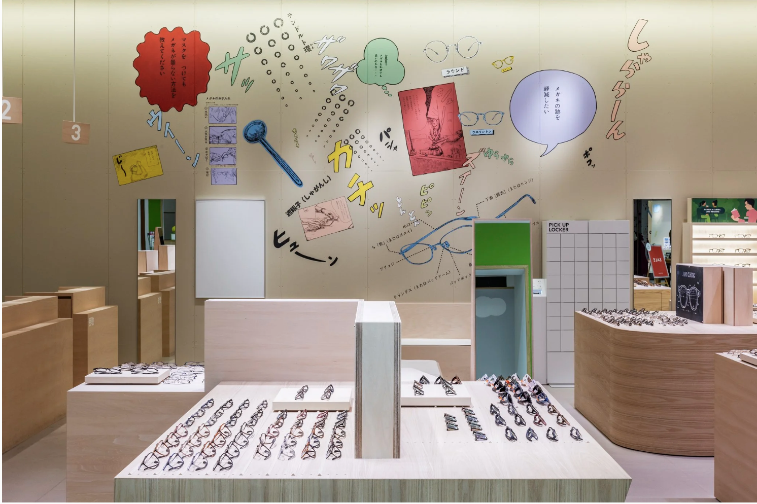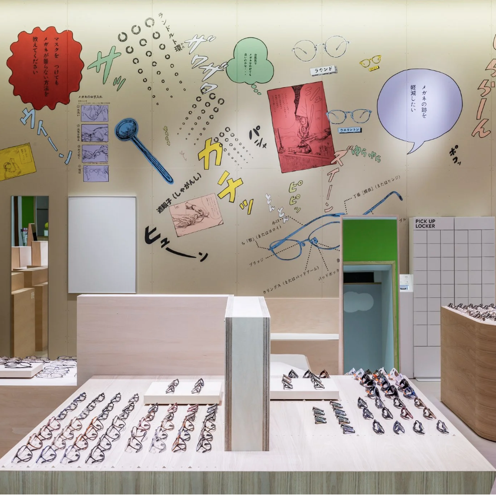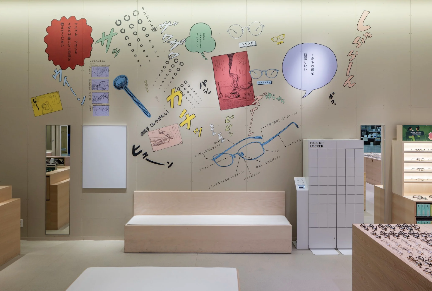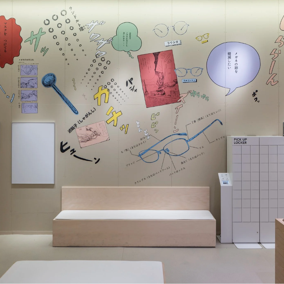 店舗がある地域は、まさに群馬の空っ風を感じる場所。「おしゃべりな壁」をテーマに描いたドローイング作品には、待ち時間にも気づきやひらめきが生まれ、豊かな体験につながって欲しいという想いが込められています。作品は、メガネの豆知識や店舗スタッフの作業風景、メガネに関連する心理描写をコラージュのように構成。オノマトペやセリフを盛り込むことで、まるで壁一面が漫画の1ページとなり、引き込まれるような作品になっています。何気ない風景の描写一つひとつに込められた物語がワクワクする時間と賑やかさを演出します。