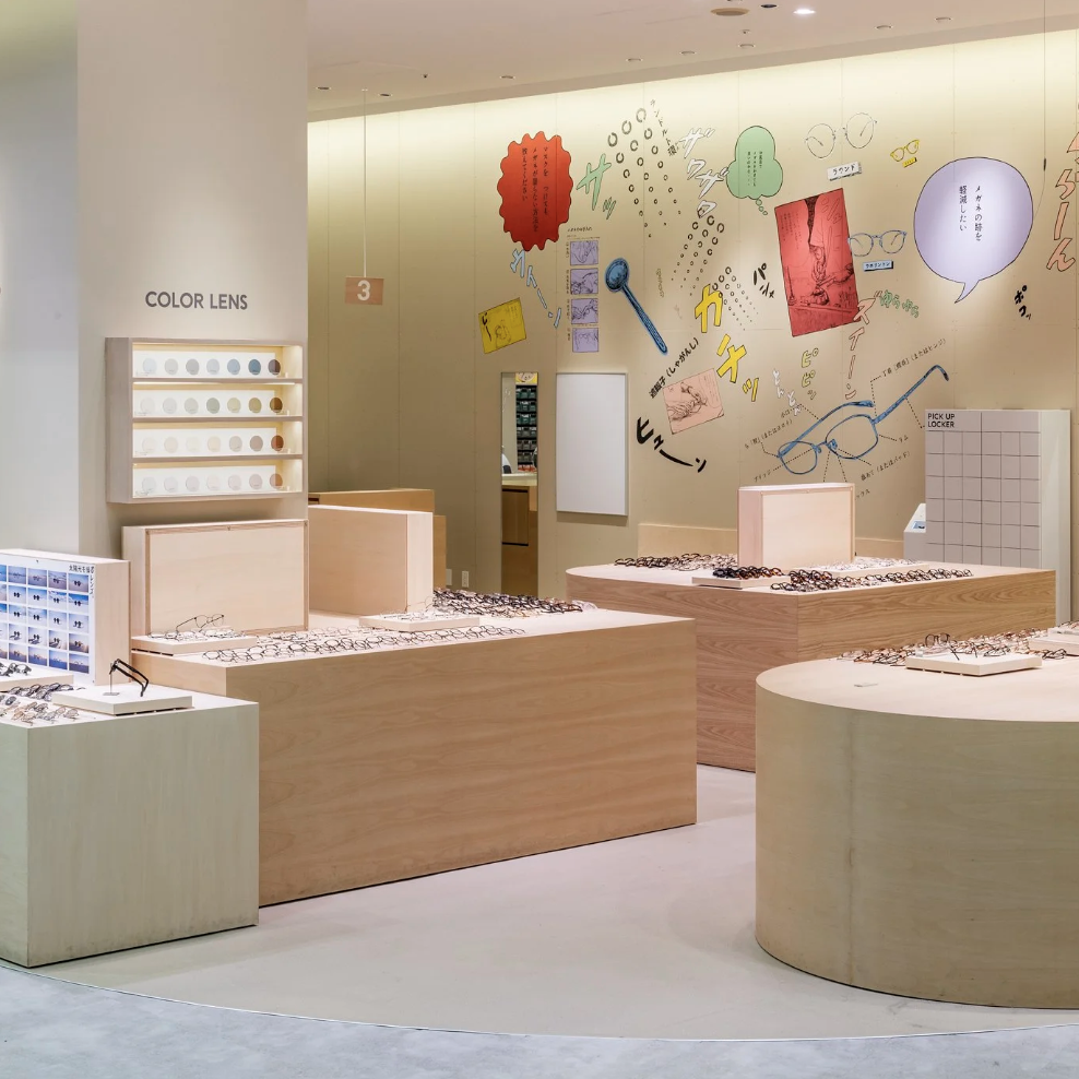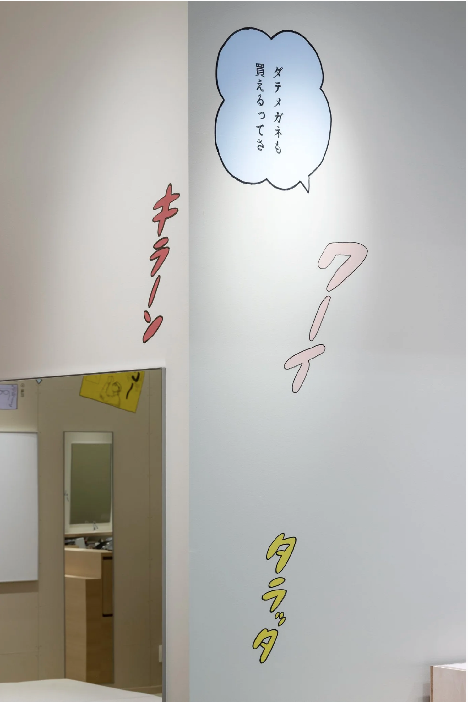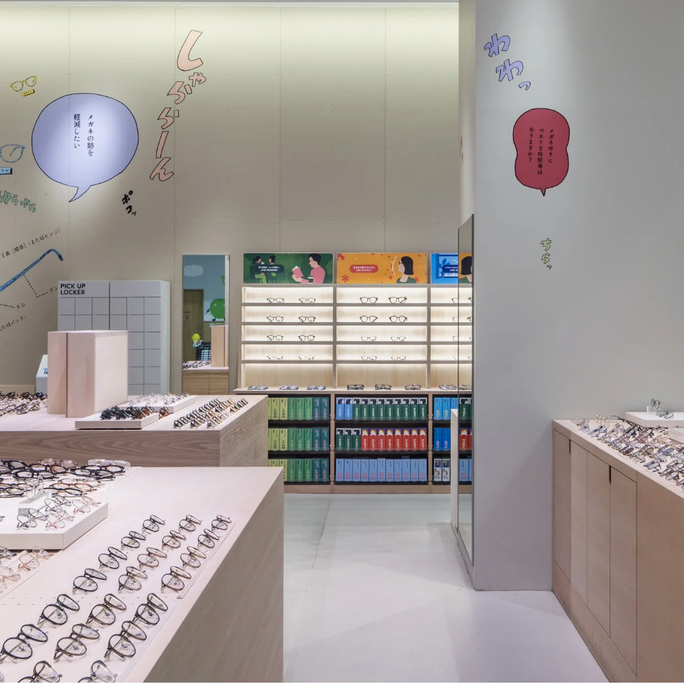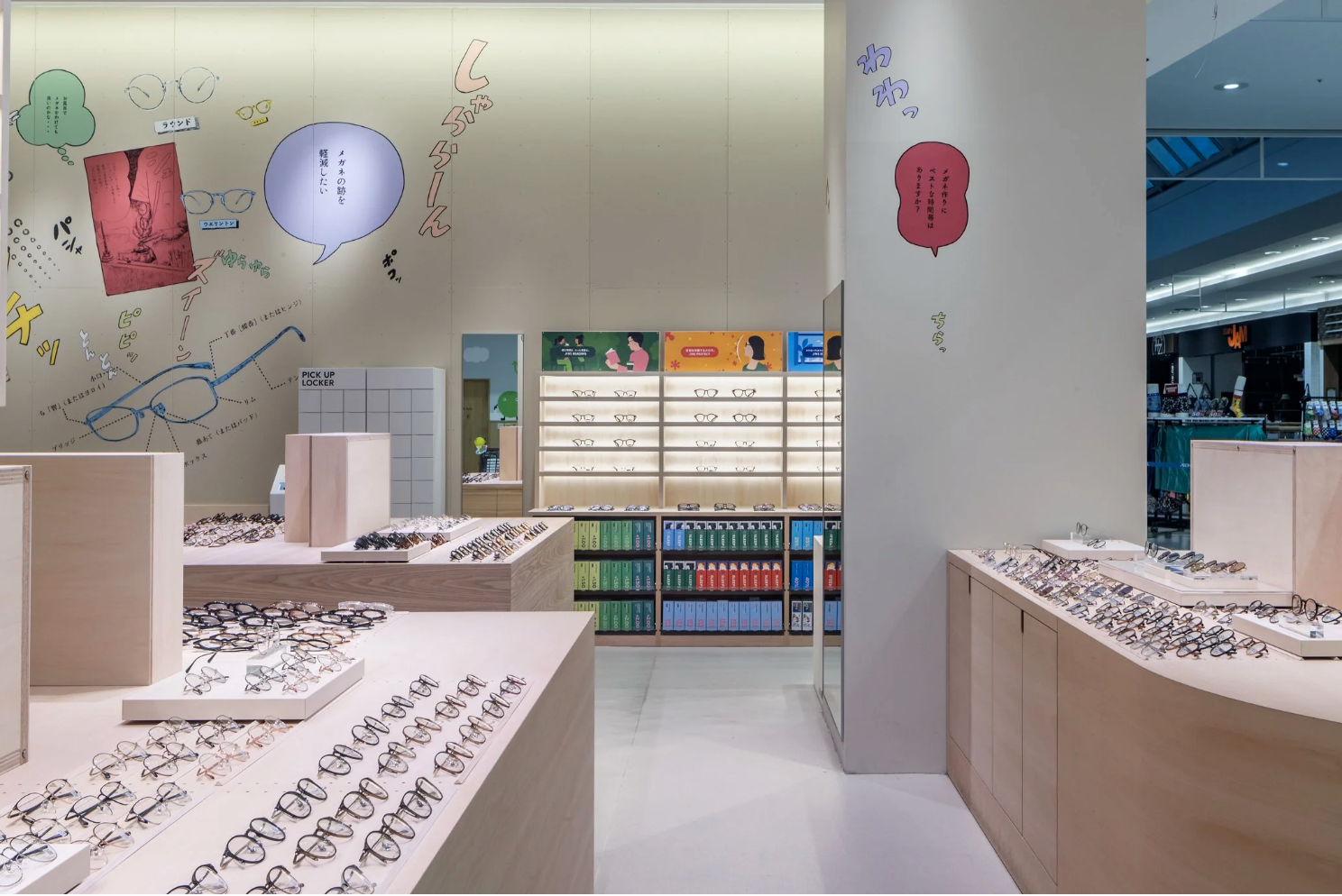 店舗がある地域は、まさに群馬の空っ風を感じる場所。「おしゃべりな壁」をテーマに描いたドローイング作品には、待ち時間にも気づきやひらめきが生まれ、豊かな体験につながって欲しいという想いが込められています。作品は、メガネの豆知識や店舗スタッフの作業風景、メガネに関連する心理描写をコラージュのように構成。オノマトペやセリフを盛り込むことで、まるで壁一面が漫画の1ページとなり、引き込まれるような作品になっています。何気ない風景の描写一つひとつに込められた物語がワクワクする時間と賑やかさを演出します。