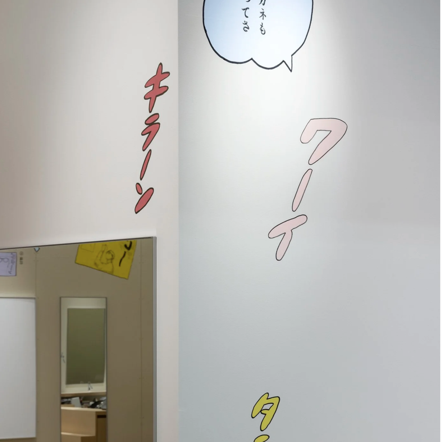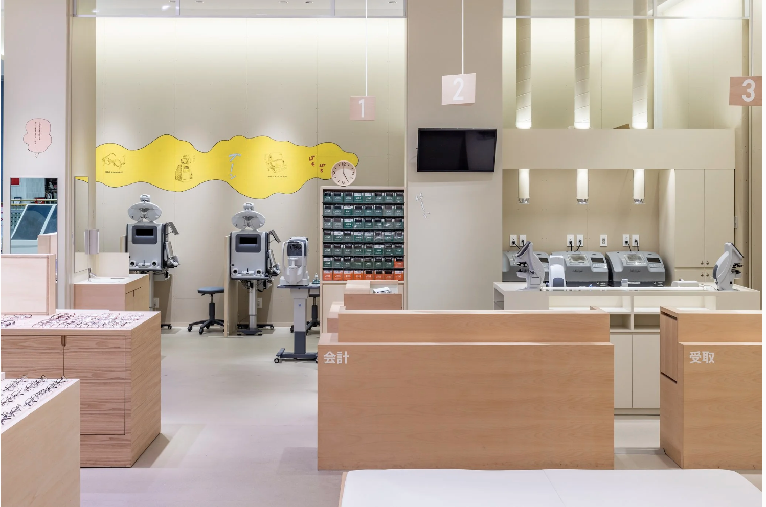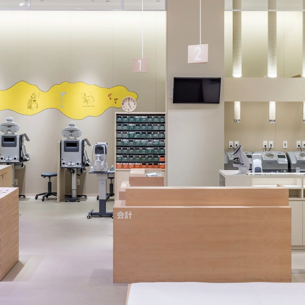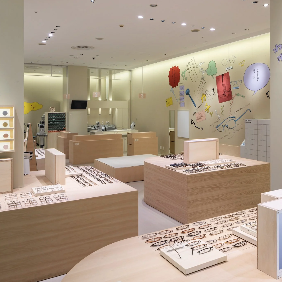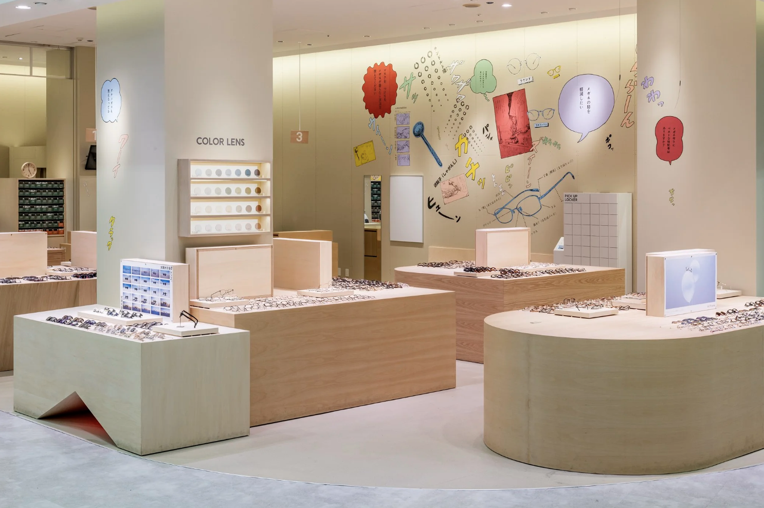 店舗がある地域は、まさに群馬の空っ風を感じる場所。「おしゃべりな壁」をテーマに描いたドローイング作品には、待ち時間にも気づきやひらめきが生まれ、豊かな体験につながって欲しいという想いが込められています。作品は、メガネの豆知識や店舗スタッフの作業風景、メガネに関連する心理描写をコラージュのように構成。オノマトペやセリフを盛り込むことで、まるで壁一面が漫画の1ページとなり、引き込まれるような作品になっています。何気ない風景の描写一つひとつに込められた物語がワクワクする時間と賑やかさを演出します。